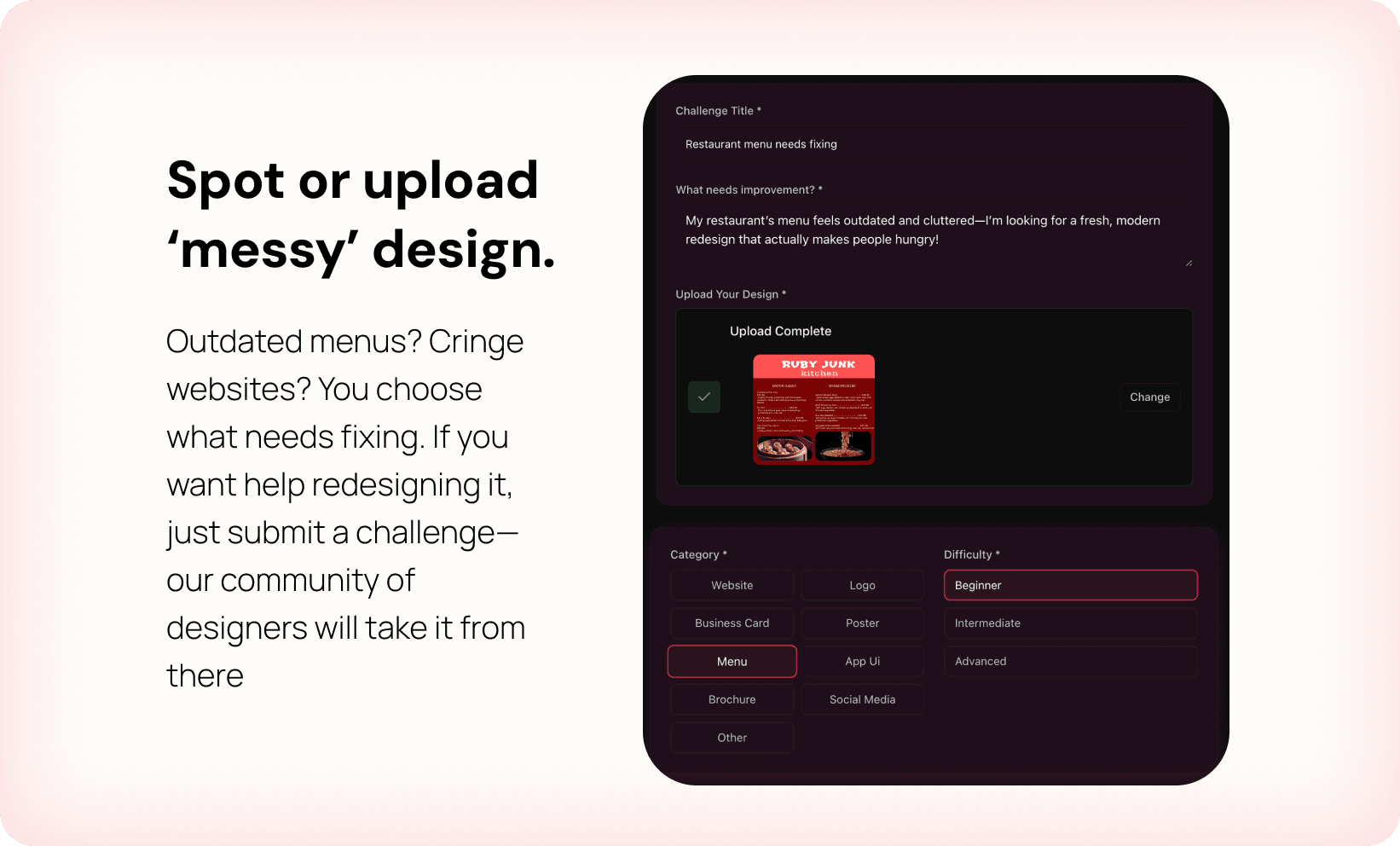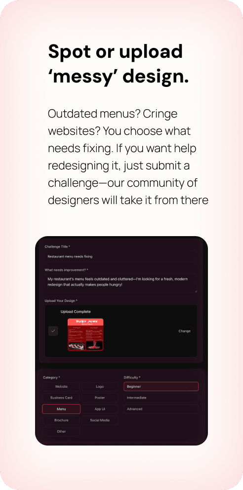 Messy menus? Outdated flyers? Clunky websites? We got you. Post your real-world design pain points and get fresh redesigns from eager creatives who want to help your brand glow up.