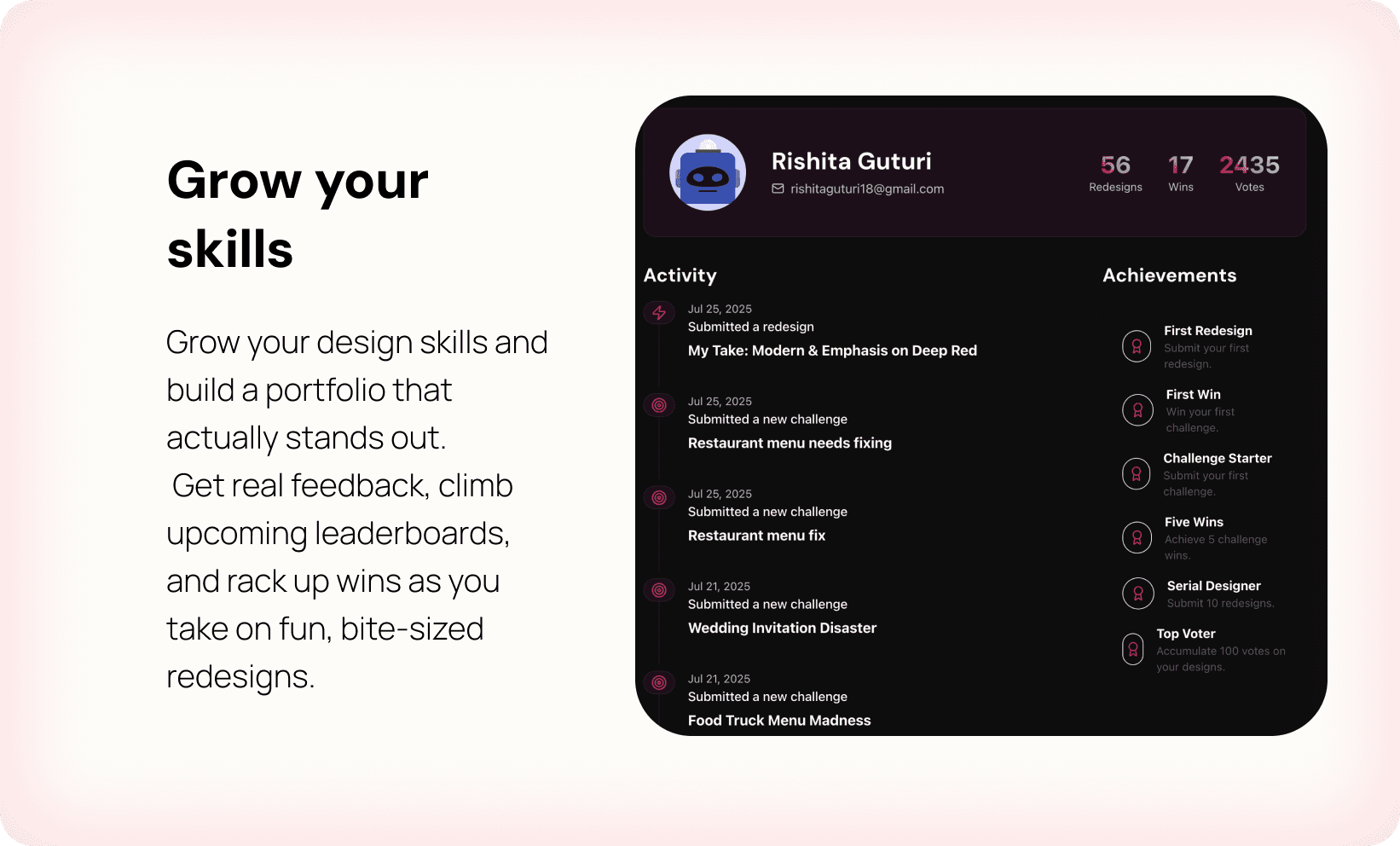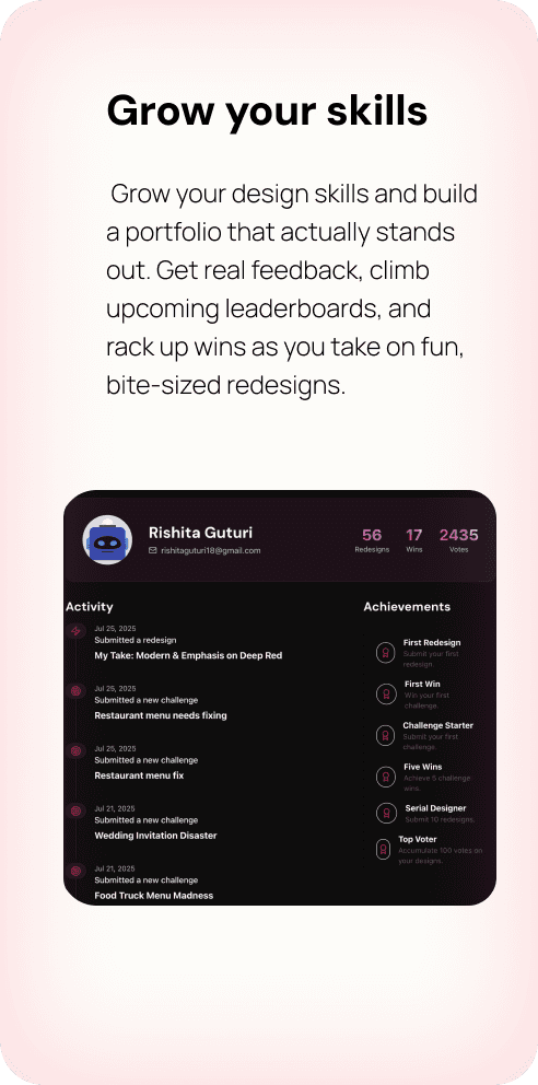 Sick of only doing fake prompts? Here, you’ll practice your skills on real, flawed designs that need love. Level up, gain wins, and get feedback that actually makes you better.