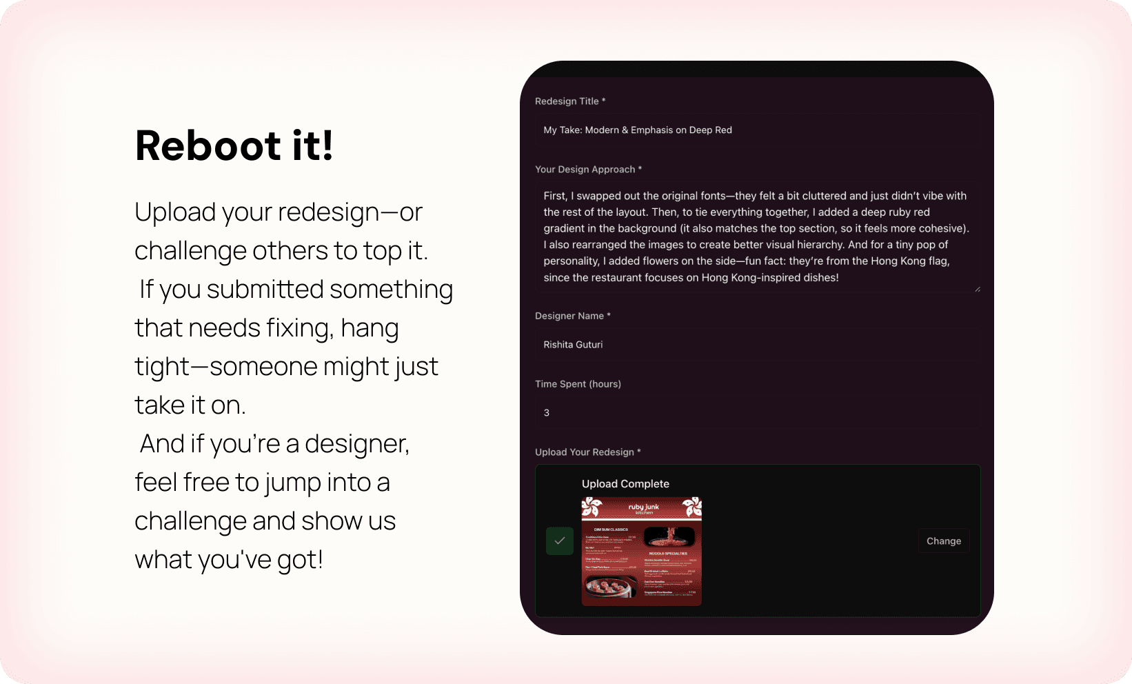 Rebooted breaks the cycle. We help designers by giving them curated prompts from small businesses, to build skills through practice.