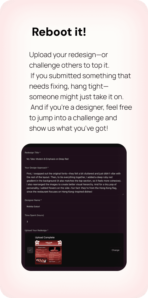 Someone posts a confusing menu, an outdated logo, or a clunky website. Designers in our community redesign it, practicing design theories and getting portfolio work. Instead of working on made-up mock projects that employers ignore, you're solving real problems with real constraints. This is your space to reimagine and inspire. From menus to logos to everything in between, it’s your chance to reboot design.